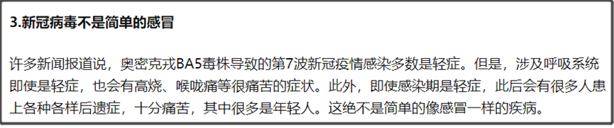 这里提到了我之前一直跟大家说的,BA.5虽然大多感染者是轻症,但这里的轻症仍然包括发高烧、喉咙剧痛等会让人十分痛苦的症状,这会让人不得不请假,会暂时失去劳动力,对民众健康,乃至整个社会经济都有巨大冲击。