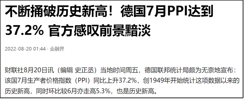 德国在8月20日公布7月的PPI数据同比增长37.2%。