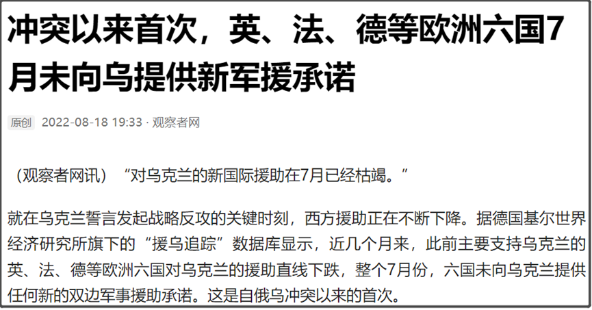 比如,法国和德国等六个国家,7月没有给乌克兰提供任何新的军事援助。