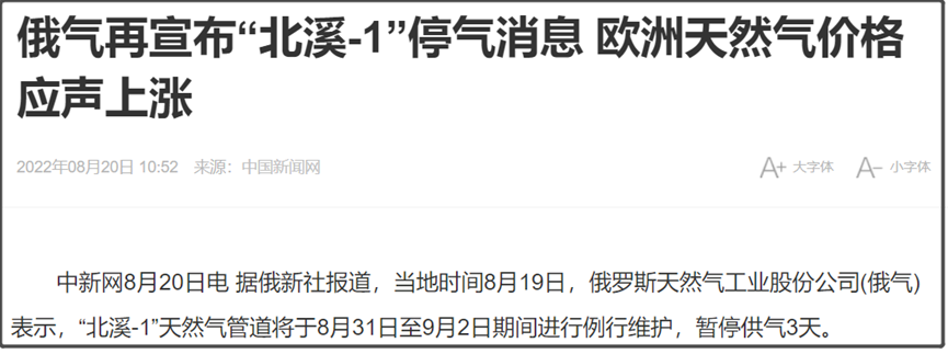 比如8月19日,俄罗斯又宣布北溪1号将再次进行为期3天的“例行”维护,将暂停供气3天。