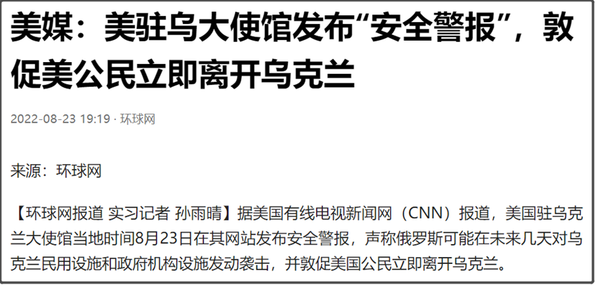 在8月23日,美国驻乌克兰大使馆,突然有发布了“安全警报”,敦促美国公民立即离开乌克兰。