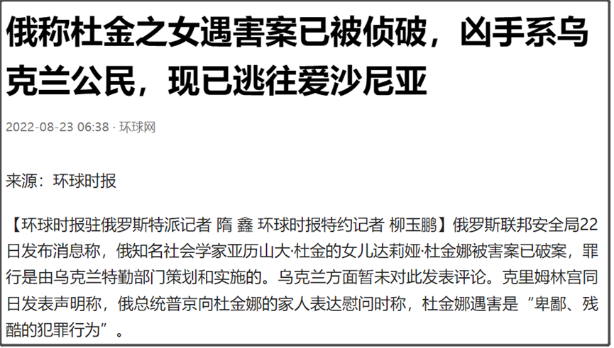 8月22日,俄联邦安全局表示,杜金之女被害案是由乌克兰特勤部门准备和实施的。据俄新社报道,罪犯是一名出生于1979年的乌克兰公民,她于今年7月23日携女儿抵达俄罗斯,在杜金娜住所附近租房居住,以搜集有关她起居的信息。杜金娜驾驶的汽车发生爆炸后,此人于21日与女儿前往爱沙尼亚。