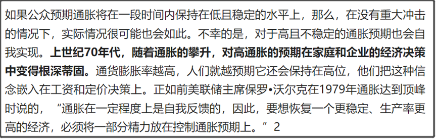 鲍威尔这段话的意思是,如果人们对于高通胀的预期十分稳固,就会加速这种“自我反馈”,导致高通胀长期持续化,这是通胀之所以容易变成根深蒂固问题的缘故。
