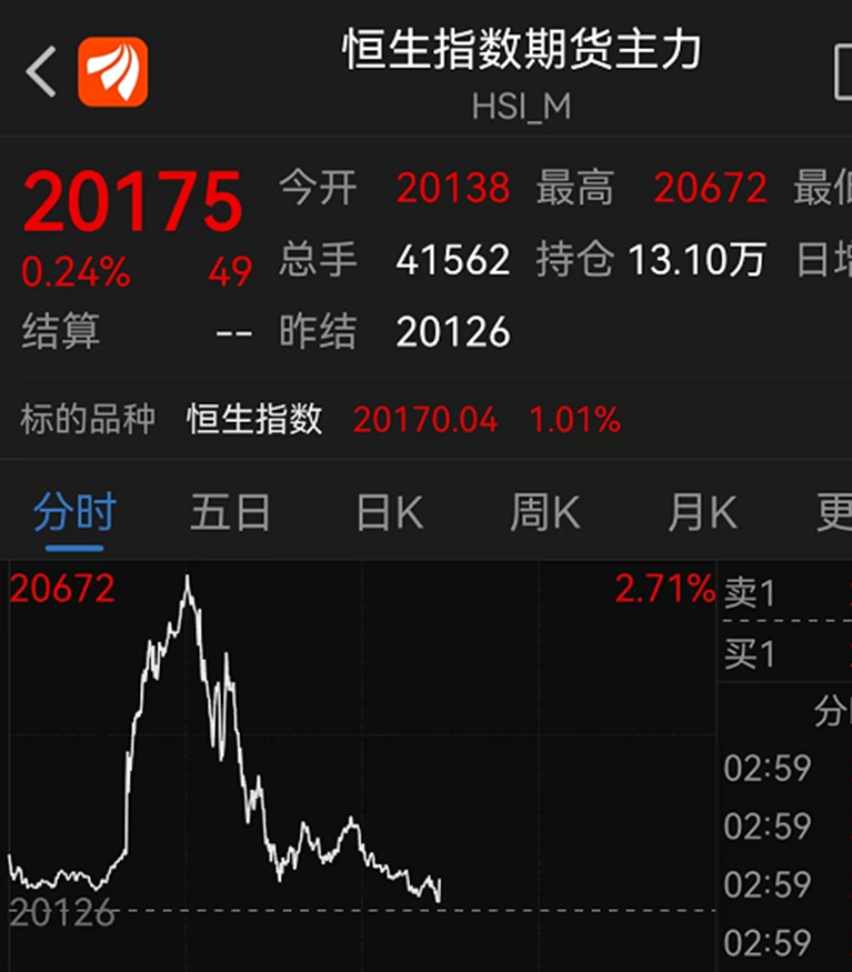 这个消息一出,中概股马上出现大幅度拉升,其中以恒生指数期货表现得尤为明显。