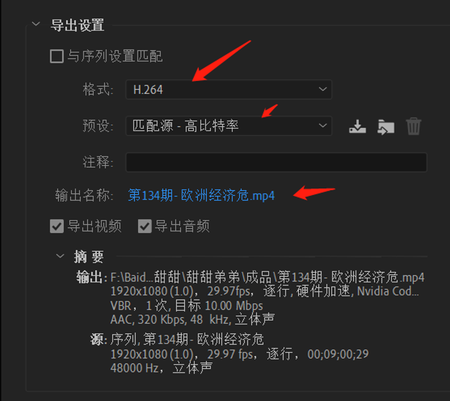 导出设置里,正常格式是选H.264,预设选匹配源。