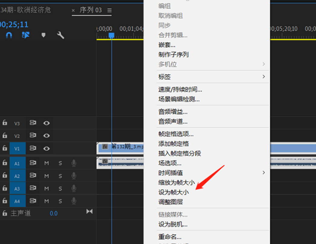 这个时候,我们只要右键素材,然后点击“设为帧大小”就可以把画面调整为,横版视频居中的竖版模式。