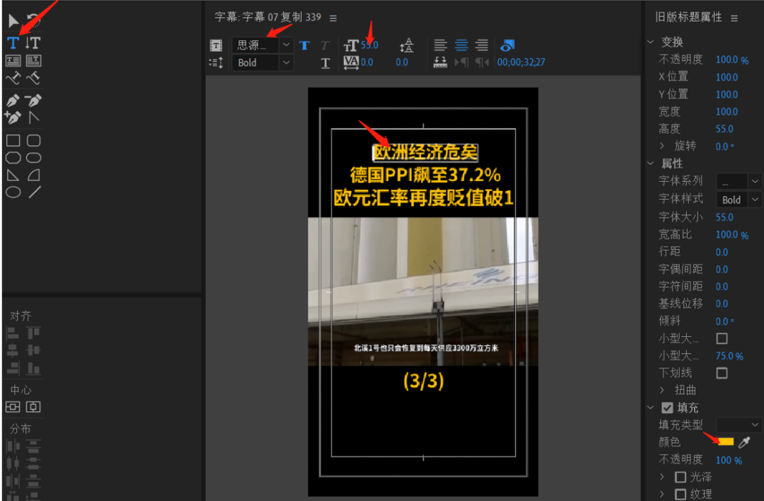 右侧的“填充”里可以修改文字的颜色,然后一定要注意,字体要改成“思源黑体”这种开源免费字体,千万不要用商业字体。