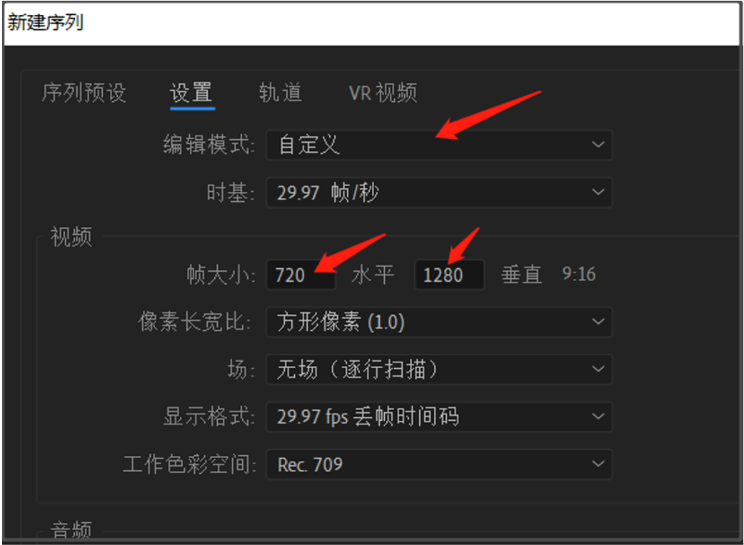 然后在“编辑模式”里改成“自定义”,就可以手动设置“帧大小”为720*1280,其他设置就不用改,直接点确定就行。