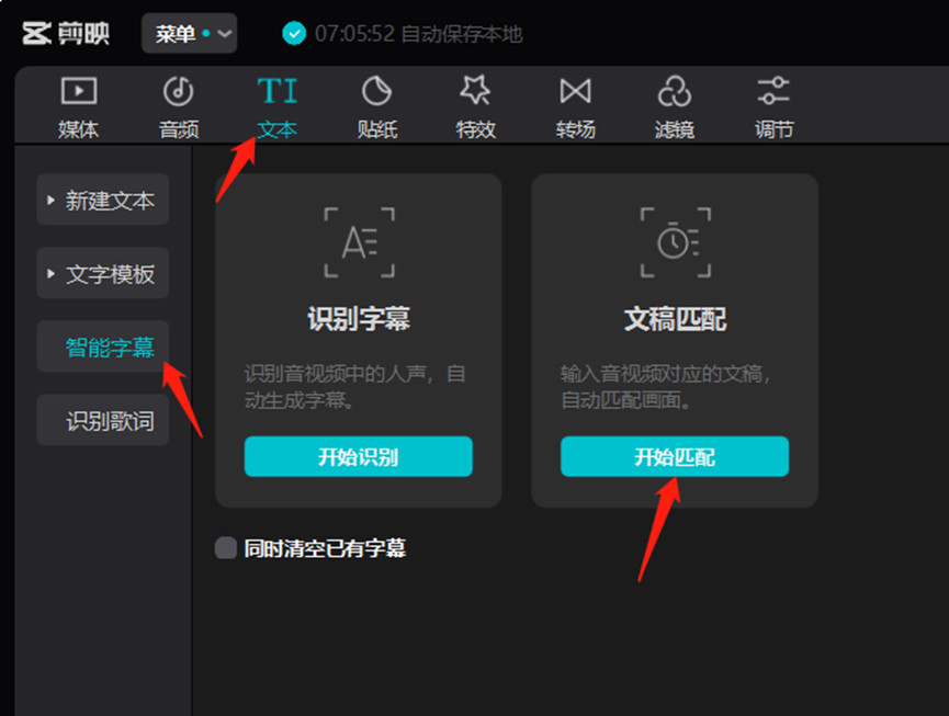 然后点上方的“文本”按钮→再点左侧菜单的“智能字幕”→再点文稿匹配