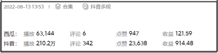比如,我在抖音最近播放量最多的一个视频,是有210万的播放量,有914元的收益,平均下来就是10万播放43元。