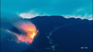 图里的左侧红色火光,是熊熊燃烧的无情山火。