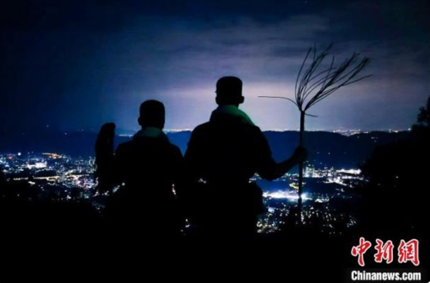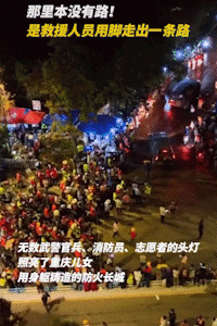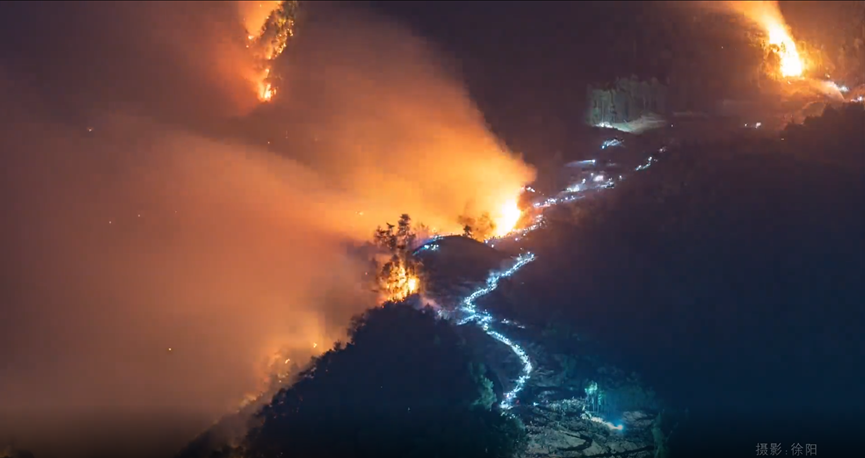 而右侧组成蓝色人龙的是无数消防勇士、志愿者戴着的头灯,组成的“防火长城”!