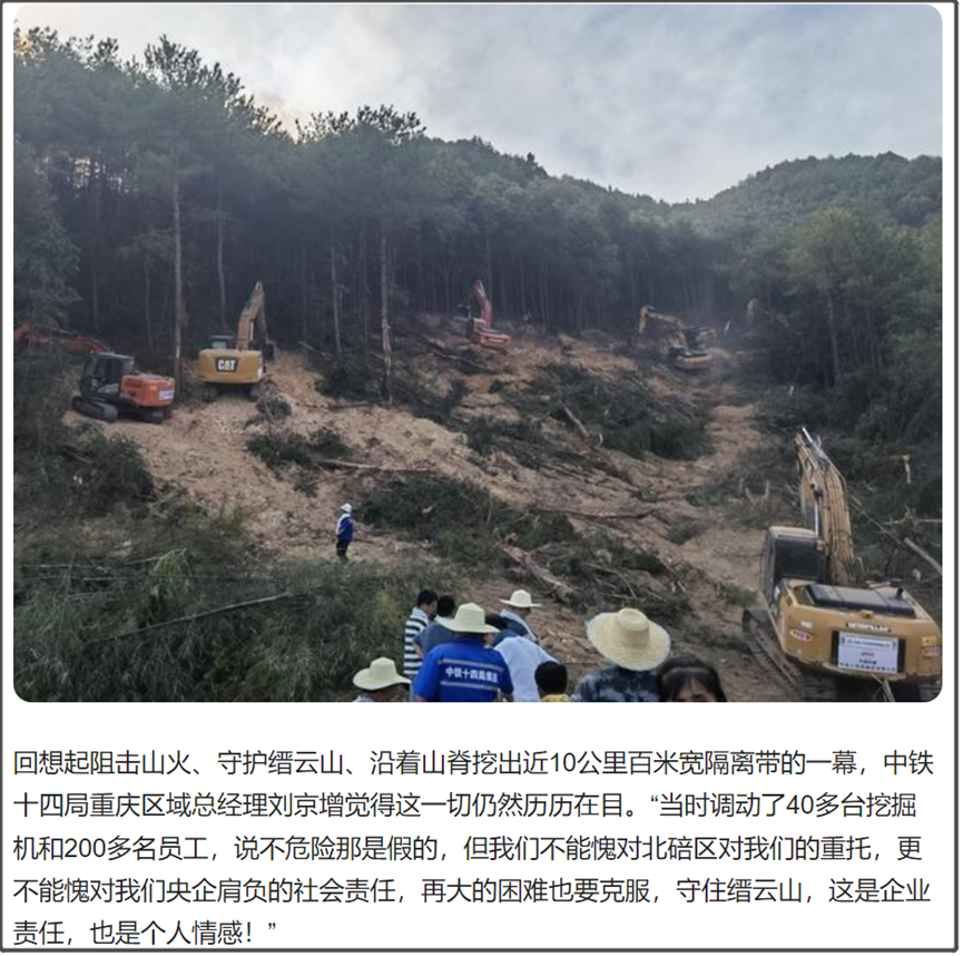 而这次,重庆山火发生后,中铁十四局就在组织下,动员了200多名员工,调动了40多台挖掘机,沿着山脊挖出近10公里长、百米宽的隔离带,这为后续扑灭山火,奠定了基础。