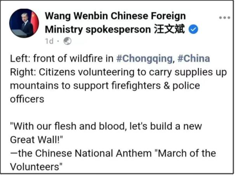 我们的发言人在海外发了这样比较壮观的对抗山火的防火长城,图片引起很大的反响。