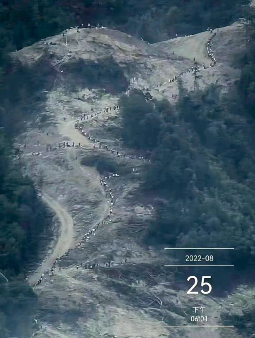 除此之外,志愿者还组成人链,在接力往山上传送救援物资。