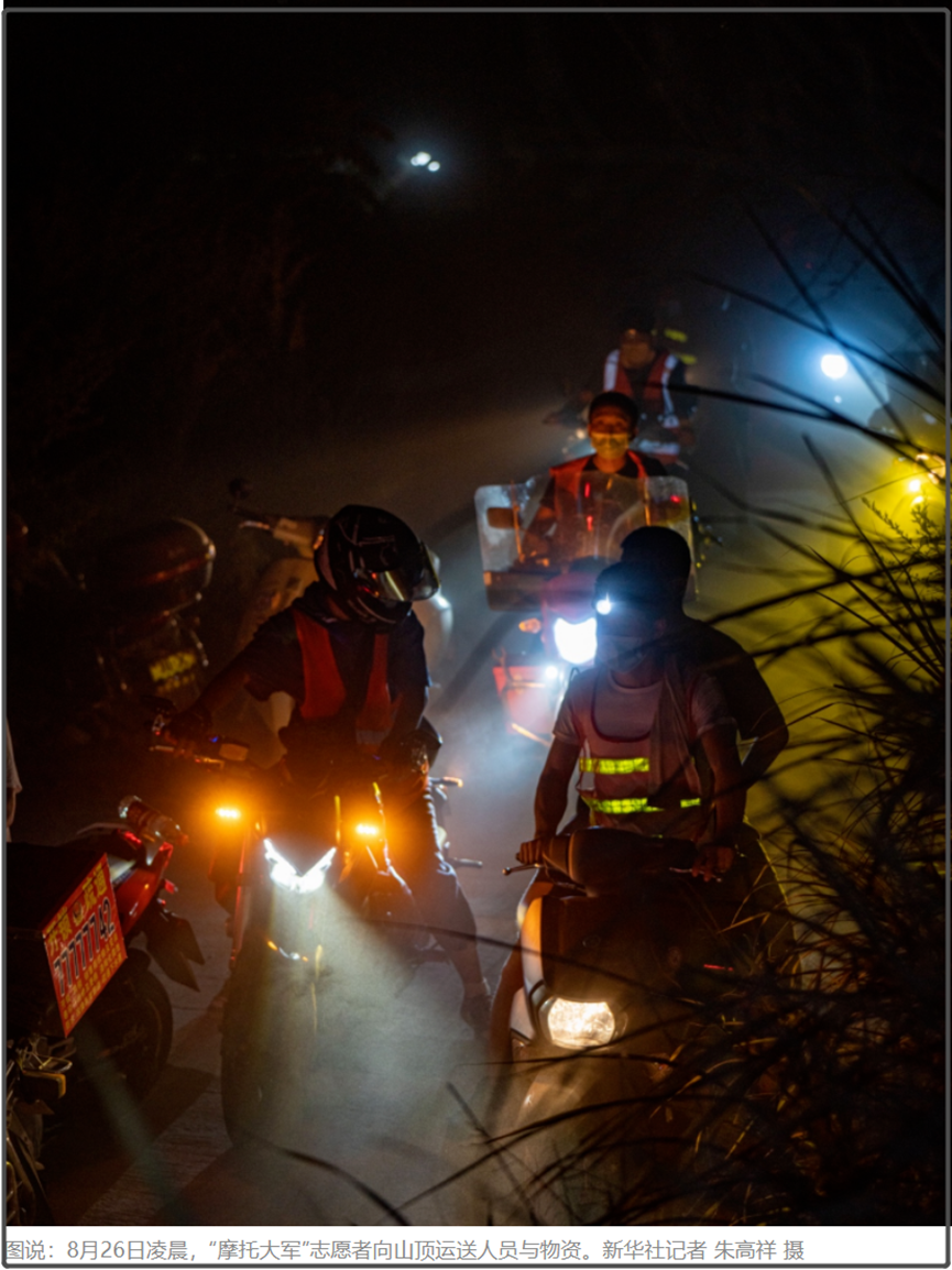 这些摩托大军,大都是重庆民众自发形成,主要是向山顶运送救援人员和物资。