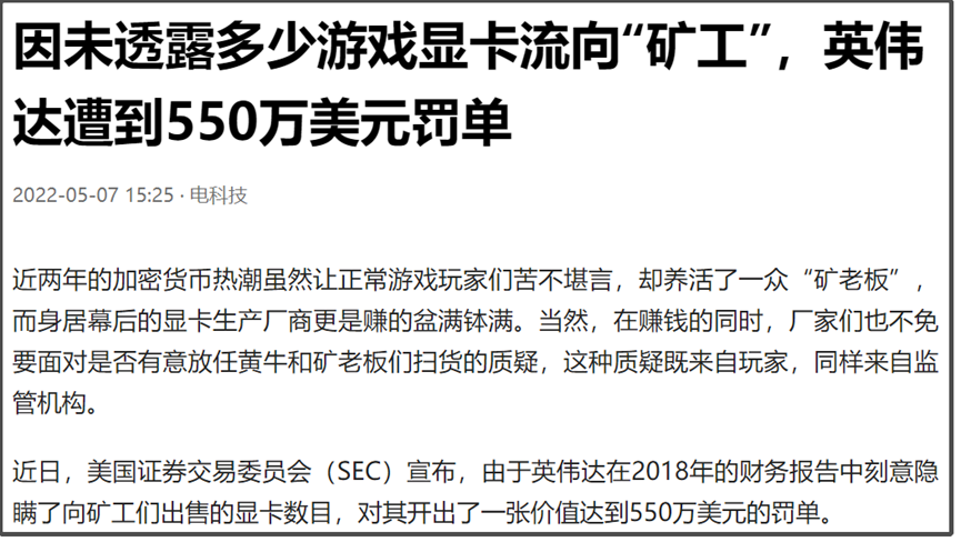 英伟达今年还因为在2018年刻意隐瞒向矿工出售显卡数量,而被美国SEC开出550万美元的罚单。