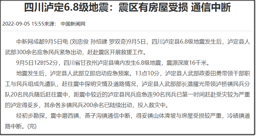 本次四川泸定地震的震源深度是16公里,已经是比较浅的范围。