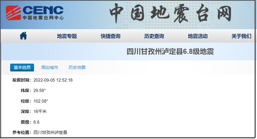 今天中午12点52分,四川省甘孜州泸定县发生6.8级地震,震源深度16公里。