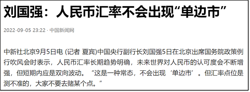 刘国强表示“人民币汇率长期趋势明确,未来世界对人民币的认可度会不断增强,但短期内应是双向波动。这是一种常态,不会出现‘单边市’。但汇率点位是测不准的,大家不要去赌某个点。”。