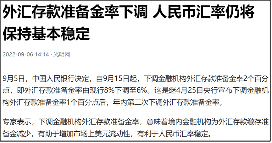 9月5日,央行宣布将下调外汇存款准备金率,从8%下调至6%。