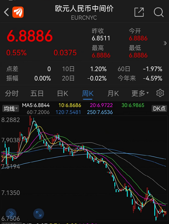 我们以欧元举例,今年我们对欧元汇率是持续升值,已经从20年的1欧元兑换8.2人民币,一路升值到现在,1欧元兑换6.88人民币。