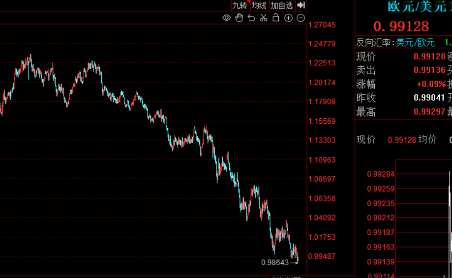 欧元今天倒是波动不大,但也已经连续几天徘徊在跟美元1:1之下,处于弱势震荡。