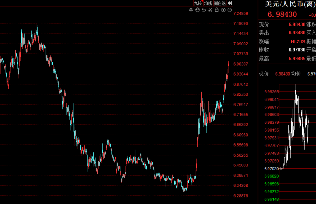 人民币今天也一度贬值到6.99,差一点就摸到7这个整数关口。