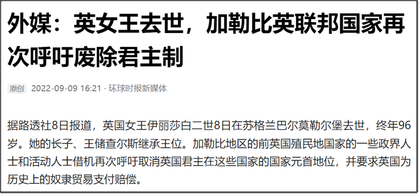 比如,这英国女王才刚去世不到一天,加勒比地区一些英联邦王国的成员国,就已经有人在开始呼吁取消英国君主在这些国家的国家元首地位,并要求英国为历史上的奴隶贸易支付赔偿。