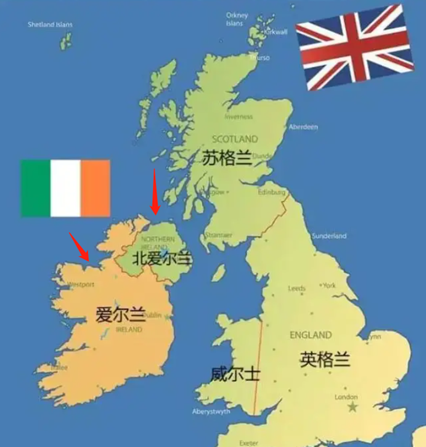 北爱尔兰虽然归属于英国,但跟英国不是在一个岛上,反而是跟爱尔兰是相邻。