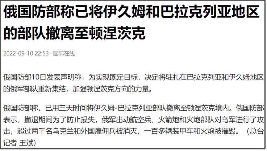 考虑到俄罗斯国防部的公告是说,“决定将驻扎在巴拉克列亚和伊久姆地区的俄军部队重新集结,加强顿涅茨克方向的力量。”