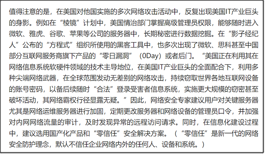 这段话里提到,美国对他国实施的多次网络攻击活动中,反复出现美国IT产业巨头的身影。