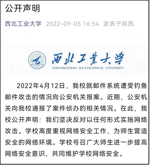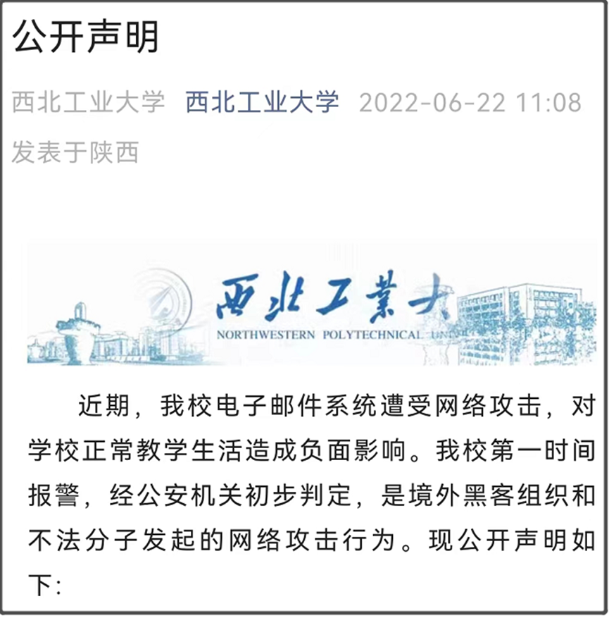 在报警后,于今年6月22日,西北工业大学发表一份声明,已经说了是“境外黑客组织和不法分子发起的网络攻击行为”。