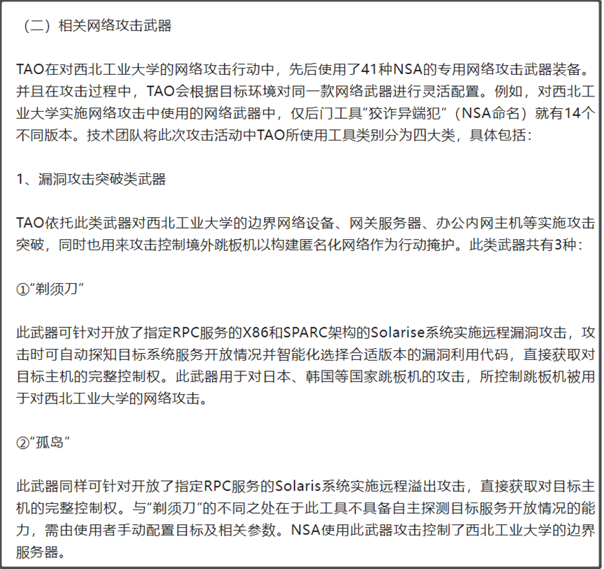 根据报告披露,美国TAO先后使用了41种网络攻击工具,这些网络攻击工具,外面市面上是看不到的,是美国国家安全局专用的网络攻击武器装备。