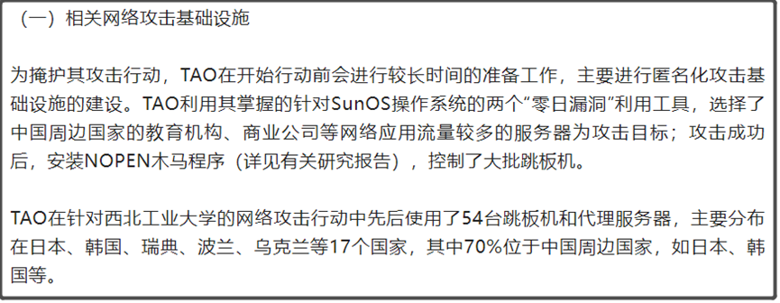 美国TAO是先选择了在我们周边国家的教育机构、商业公司的服务器,来进行攻击,通过给我们周边国家的教育机构安装NOPEN木马程序,从而控制大批跳板机。