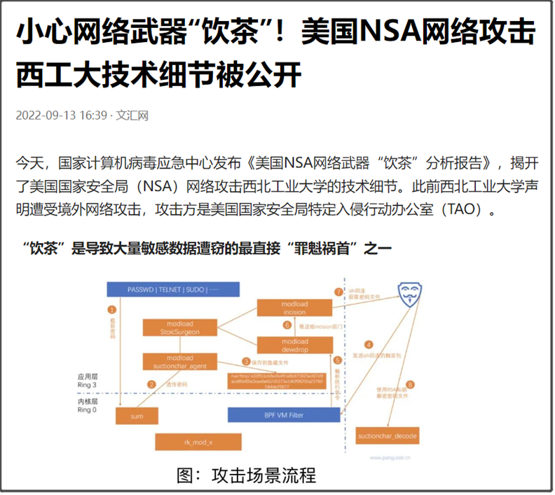 今天国家计算机病毒应急中心,还单独重点披露了美国国家安全局其中一款名字叫做“饮茶”的网络武器。