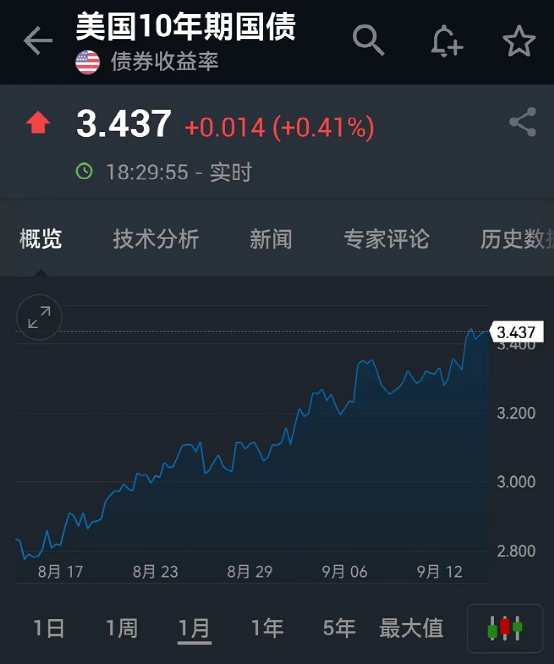 美国10年期国债收益率,在过去一个月,已经从最低2.7%收益率,一路飙升到现在3.437%。