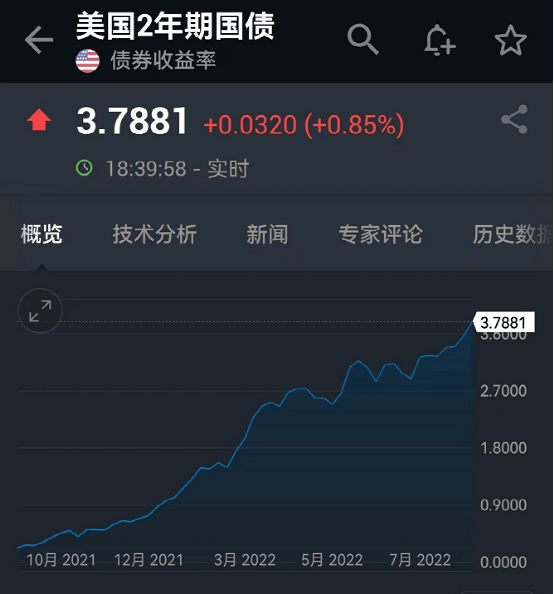 美国2年期国债更是一路飙升到惊人的3.7881%。