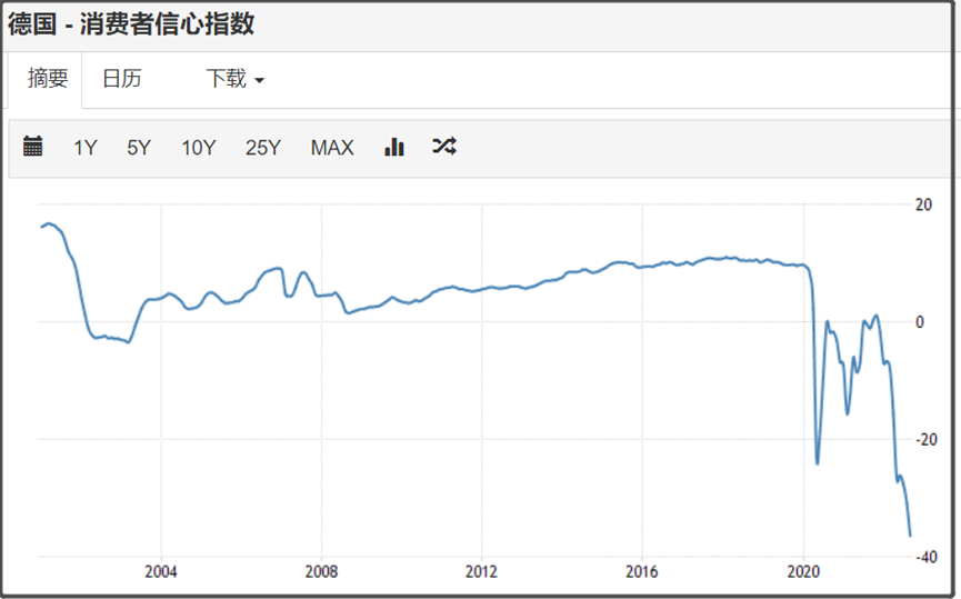 德国的消费者信心指数,都跌到负30了,比2020年疫情刚爆发的时候还要低。
