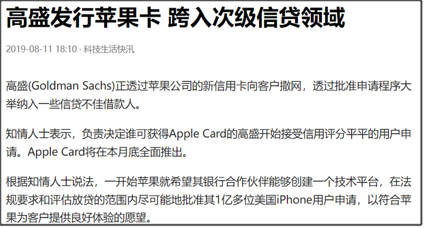 这个Apple Card是2019年推出的,当时刚推出时,就有一些大机构认为,高盛可能会在下一次经济衰退中,因为Apple Card赔钱。