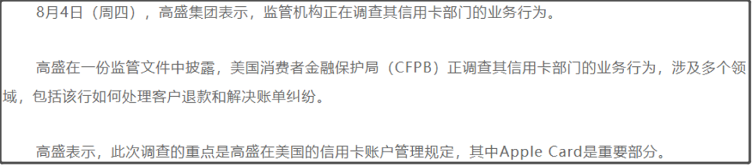 早在今年8月4日,高盛集团就表示,监管机构正在调查其信用卡部门的业务行为。
