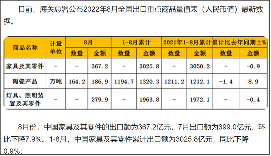 海关总署发布的8月出口分类数据里,其中8月家具出口额是环比下降了7.9%。