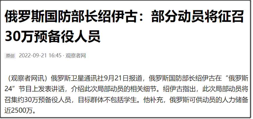 在普京宣布进行“部分动员”后,俄罗斯国防部长就介绍了本次局部动员的相关细节,其中包括召集约30万预备役人员。