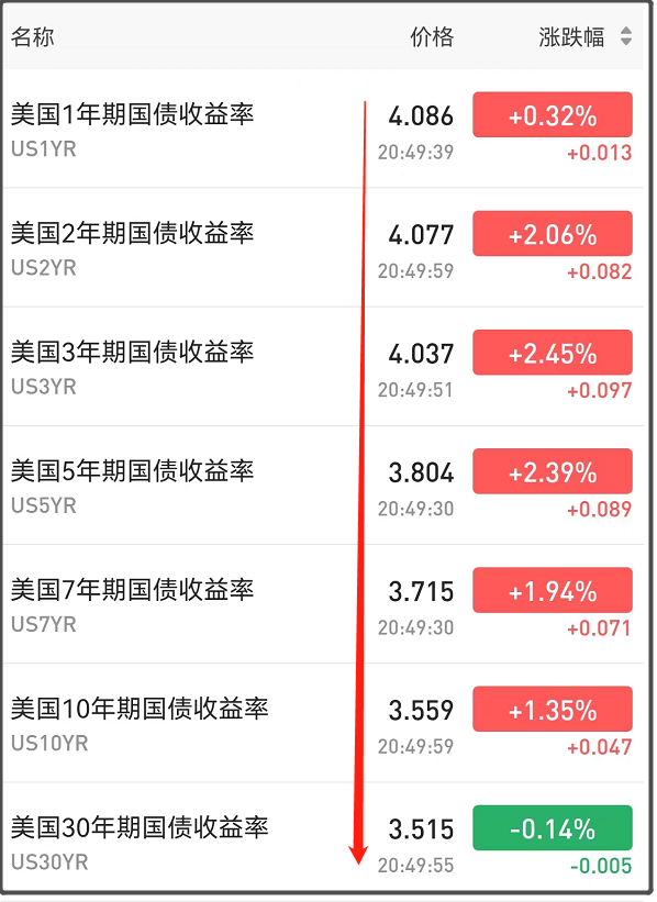 可以从上图看到,美债现在随着年限越长,反而收益率越低,年限越短,收益率越高。