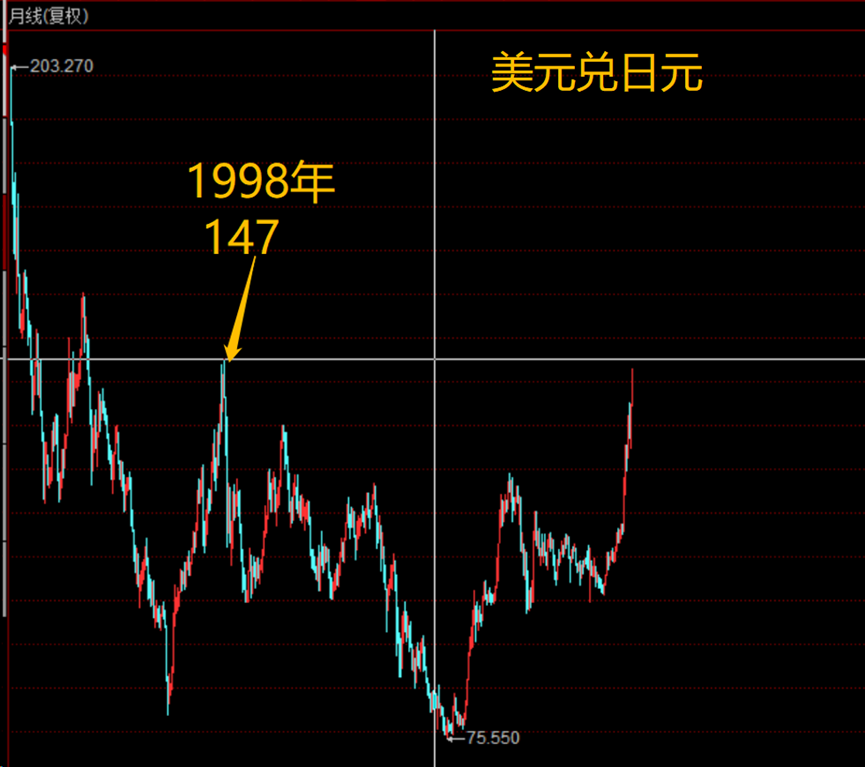 上一次是1998年,亚洲金融危机爆发的时候,当时日元是一路贬值到147。