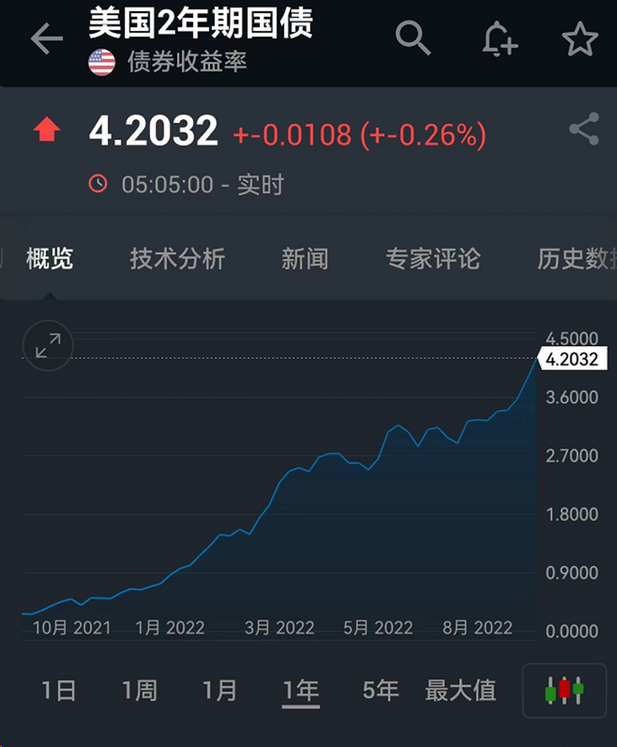 美国2年期国债收益率,更是飙升到了4.2%这个夸张的水平。