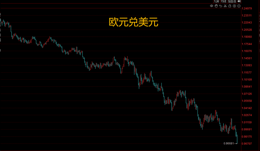 而欧元前段时间在1:1的汇率上挣扎一段时间后,最近也已经彻底跌破跟美元1:1的汇率,已经贬值到0.97,欧元已经不如美元值钱。