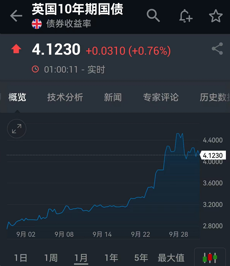 英国10年期国债收益率过去一个月,从2.8%收益率,一度飙升到4.6%收益率,这意味着英国债券市场正处于崩跌的走势。
