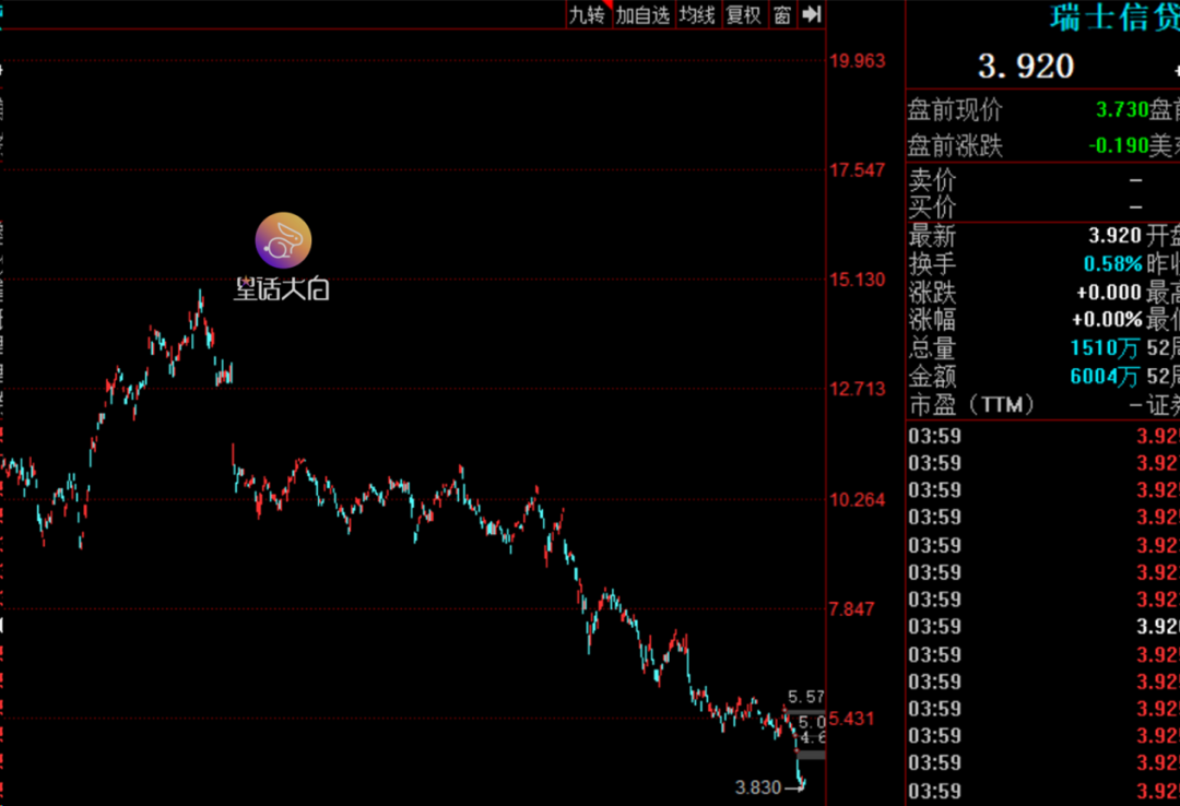 包括瑞信的股价也是一路从14.8美元跌到现在最低3.83美元,也是连续腰斩的走势。