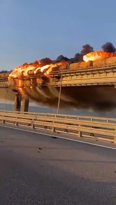 在10月8日早上6时7分,一辆卡车在克里米亚大桥的汽车通行处发生爆炸,引燃一辆前往克里米亚半岛方向的火车,火车上7个油罐起火。